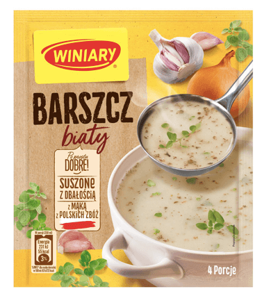 Winiary Barszcz biały Nasza Specjalność to tradycyjnie polska zupa o lekko kremowej konsystencji, kwaskowatym smaku, z dodatkiem przypraw takich jak majeranek, czosnek i cebula. Barszczu białego nie może zabraknąć na wielkanocnym stole, doskonale sprawdza się też jako łatwa do przyrządzenia, pożywna i rozgrzewająca zupa na co dzień. Świetnie smakuje podawany z różnymi dodatkami, takimi jak jajka, kiełbasa, purée ziemniaczane z chrzanem czy kabanosy. Można go jeść na okrągło! W Winiary dbamy o to, co ważne - dobre składniki w naszych produktach. Dlatego Barszcz biały Nasza Specjalność zawiera mąkę z polskich zbóż oraz polski czosnek, cebulę i majeranek. Winiary Barszcz biały Nasza Specjalność: - To zrównoważony, kwaskowy smak i lekko kremowa konsystencja - Powstaje ze zbóż, cebuli, czosnku i majeranku uprawianych w Polsce - Świetnie smakuje z różnymi dodatkami, np. jajkami, puree ziemniaczanym, kabanosami, dzięki czemu można go jeść na okrągło!