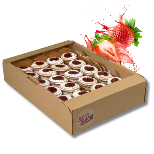 Kruche ciasteczka z marmoladą o smaku świeżych truskawek posypane cukrem pudrem.