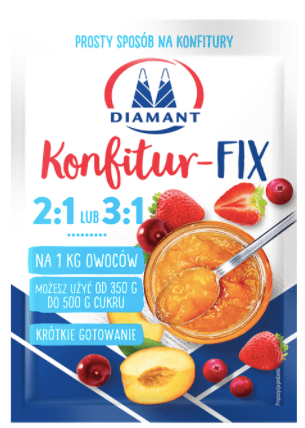 DIAMANT Konfitur-Fix to środek żelujący umożliwiający indywidualny dobór ilości cukru dostosowany do rodzaju przetwarzanych owoców oraz gustów smakowych konsumentów. Do jednego kilograma przygotowanych owoców można dodawać od 350 do 500g cukru, uzyskując bardziej lub mniej słodkie konfitury. Mimo zróżnicowanej, dowolnie dobieranej ilości cukru otrzymywane dżemy lub konfitury mają zawsze doskonałą, pożądaną konsystencję.