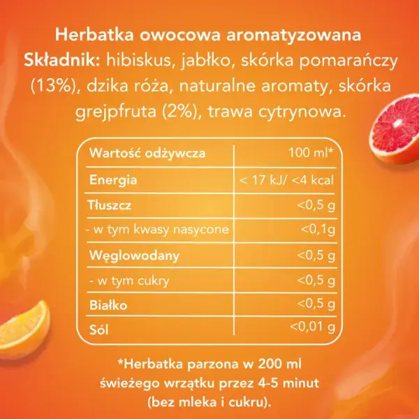 Herbata owocowa Lipton Grejpfrut Pomarańcza to wyjątkowo smaczny napar o przyjemnych cytrusowych nutach. Sięgnij po unikalny duet słodkiej pomarańczy oraz subtelnie gorzkiego grejpfruta i pokochaj owocową przyjemność zamkniętą w każdej torebce.