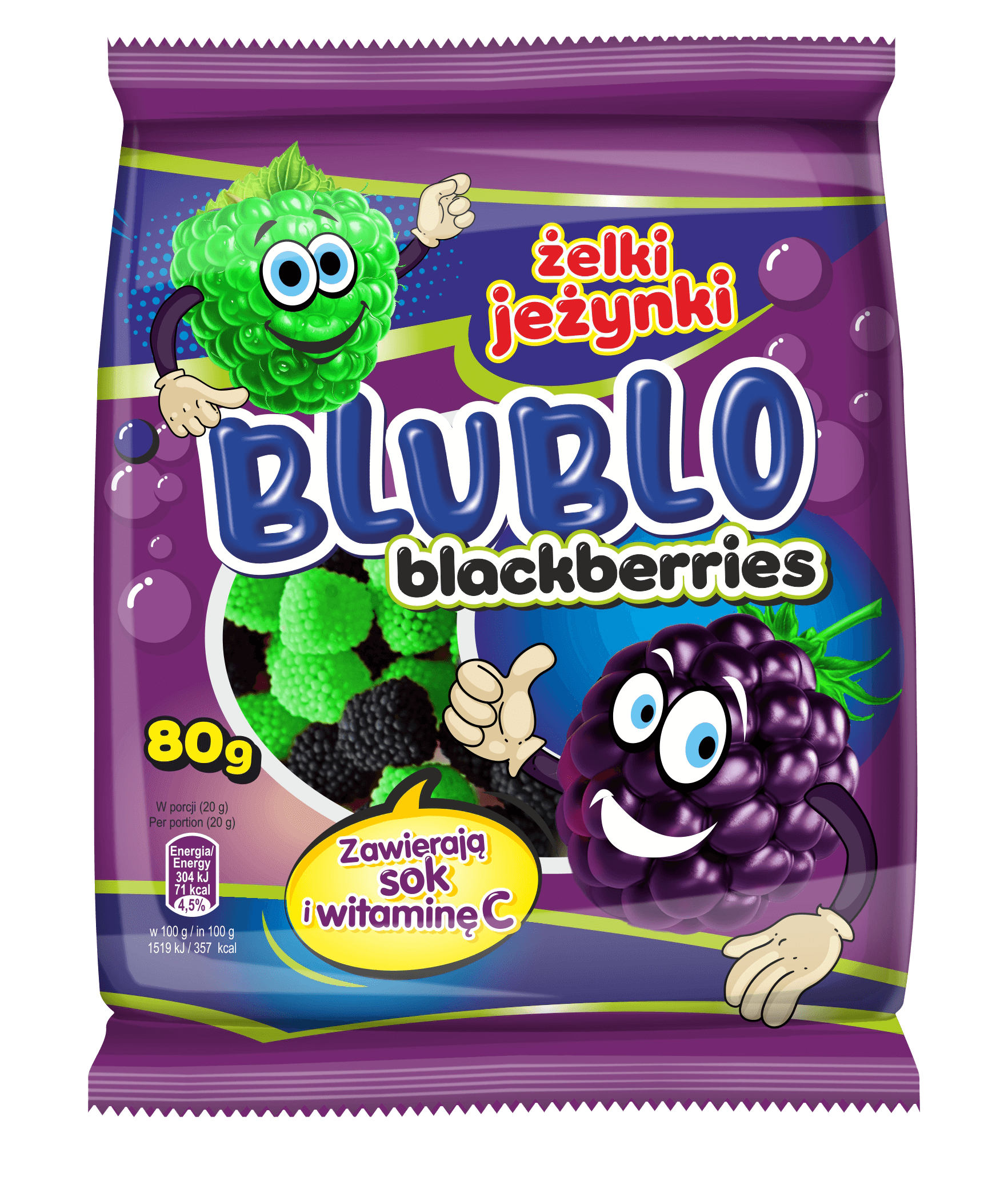 Soczyście owocowe żelki o smaku jeżyn – miękkie, sprężyste i pełne intensywnego smaku! BLUBLO Jeżynki to idealna słodka przekąska dla miłośników owocowych smaków. Doskonałe do podjadania w ciągu dnia, na imprezy i do dzielenia się z bliskimi.